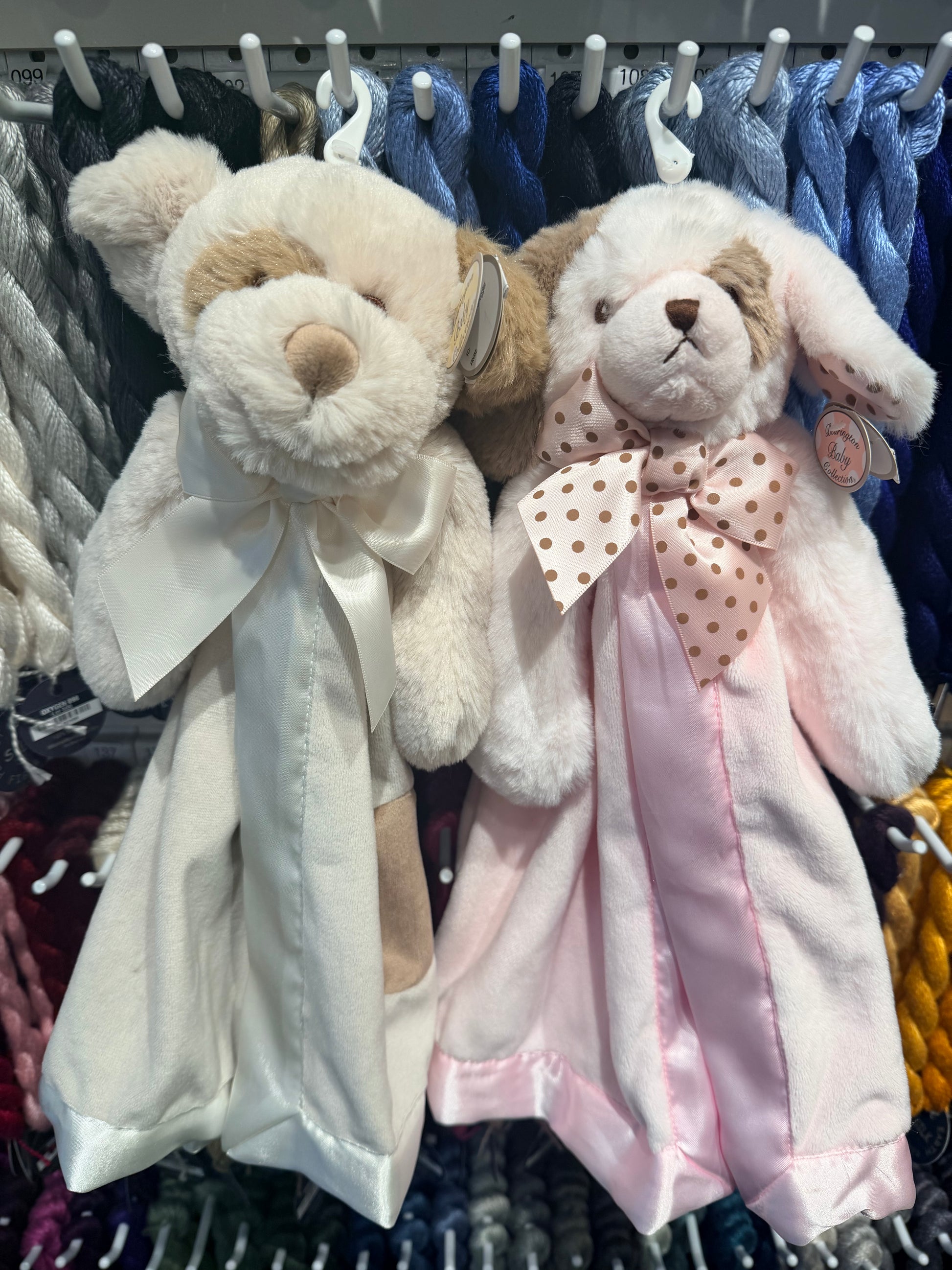 A plush puppy dog made of ultra-soft velour, silky satin lining, and embroidered, safe features, designed as a comforting companion for infants and toddlers that's also machine washable.